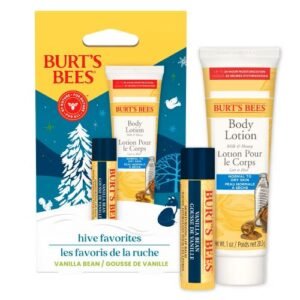 One Burt’s Bees Hive Favorites Gift Set that includes Vanilla Bean Lip Balm and Milk and Honey Body Lotion in festive packaging that’s ready for gifting