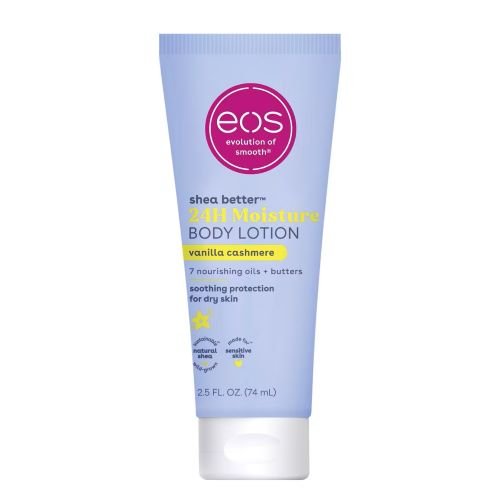 Our sweet and nuzzly Vanilla Cashmere travel size body lotion captures the warmth of whipped vanilla, the softness of musk and the coziness of the caramel for a rich, luxurious fragrance with a sensual twist. eos 24H body lotion with instantly moisturizing Shea Oil + lasting protection Shea Butter quickly absorbs for 24-hour hydration. Say hello to… fast-absorption, lightweight, soft skin, and sustainable shea. Say goodbye to… greasiness, heaviness, and sticky residue.